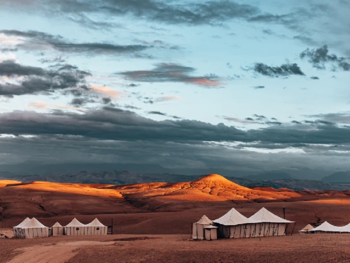 A soli 30 chilometri da Marrakech, il deserto di Agafay offre un'alternativa accessibile a chi desidera un'esperienza desertica senza allontanarsi troppo dalla città rossa. Contrariamente ai deserti sabbiosi, Agafay è caratterizzato da un paesaggio roccioso con piccole dune di sabbia dorata, altipiani aridi e canyon spettacolari. Il panorama è dominato da colori ocra e rossi, con le maestose montagne dell'Atlante sullo sfondo.